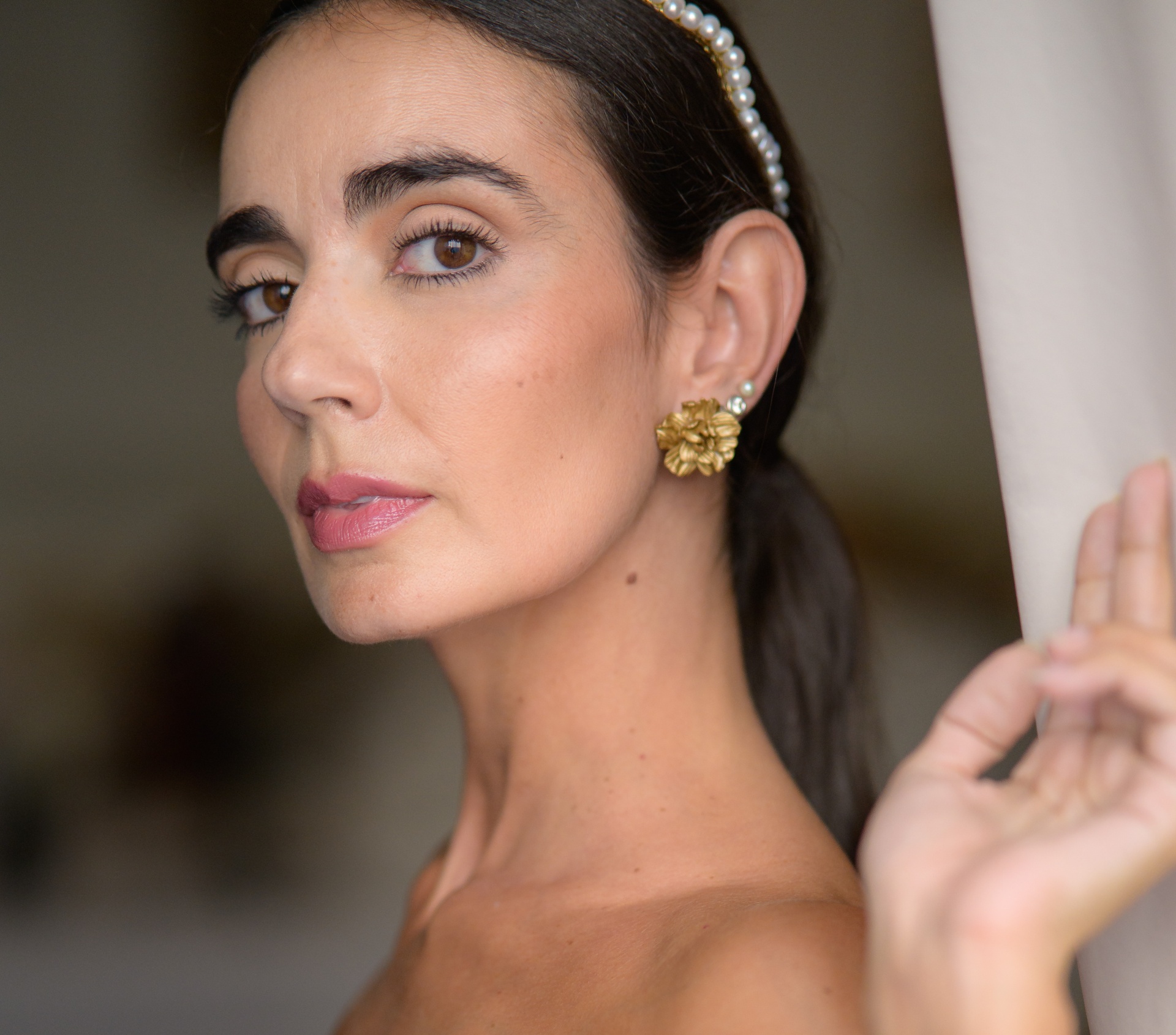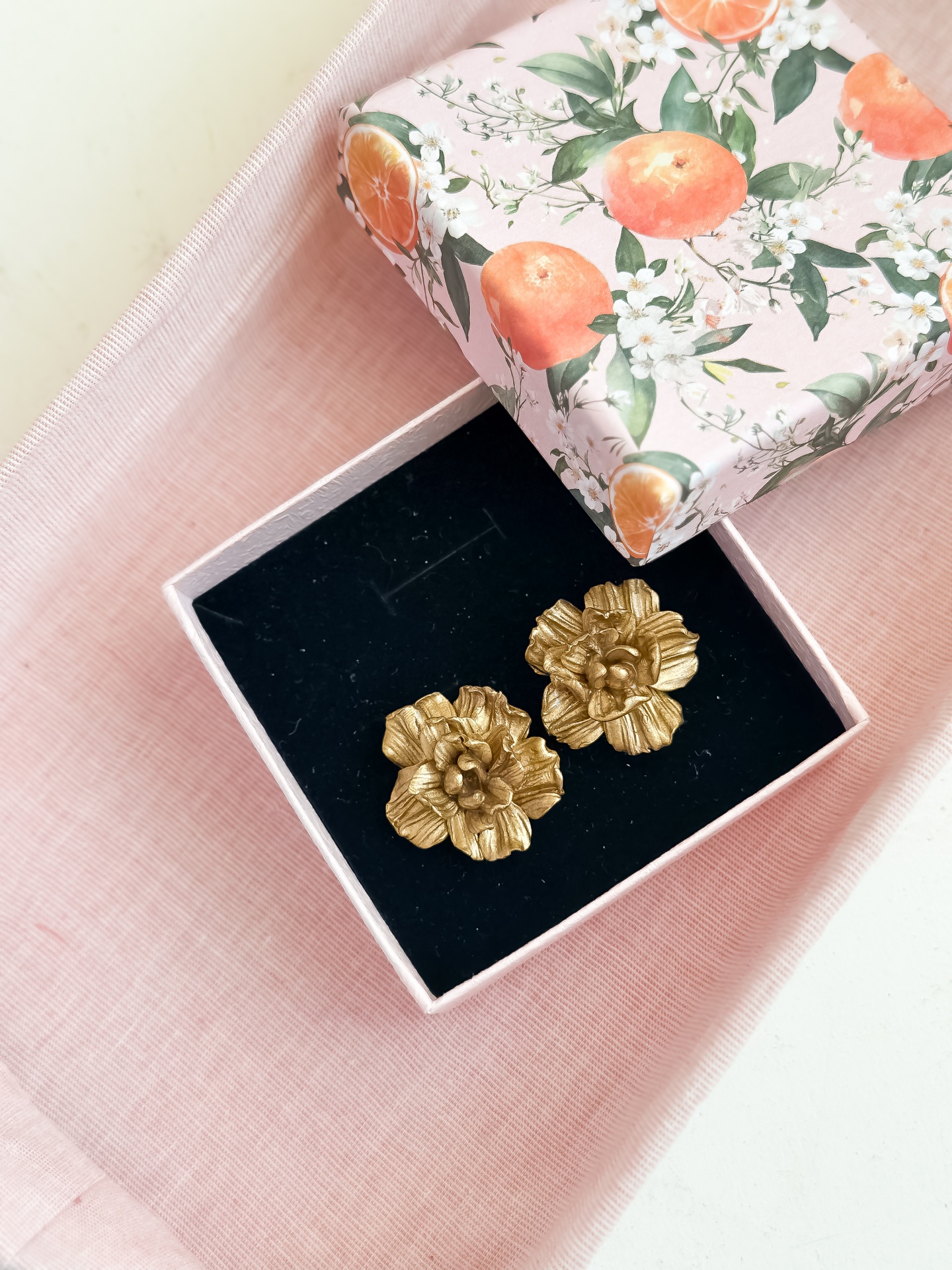 Brincos dourados, em forma de flor desabrochada. Tamanho S (existe maior)