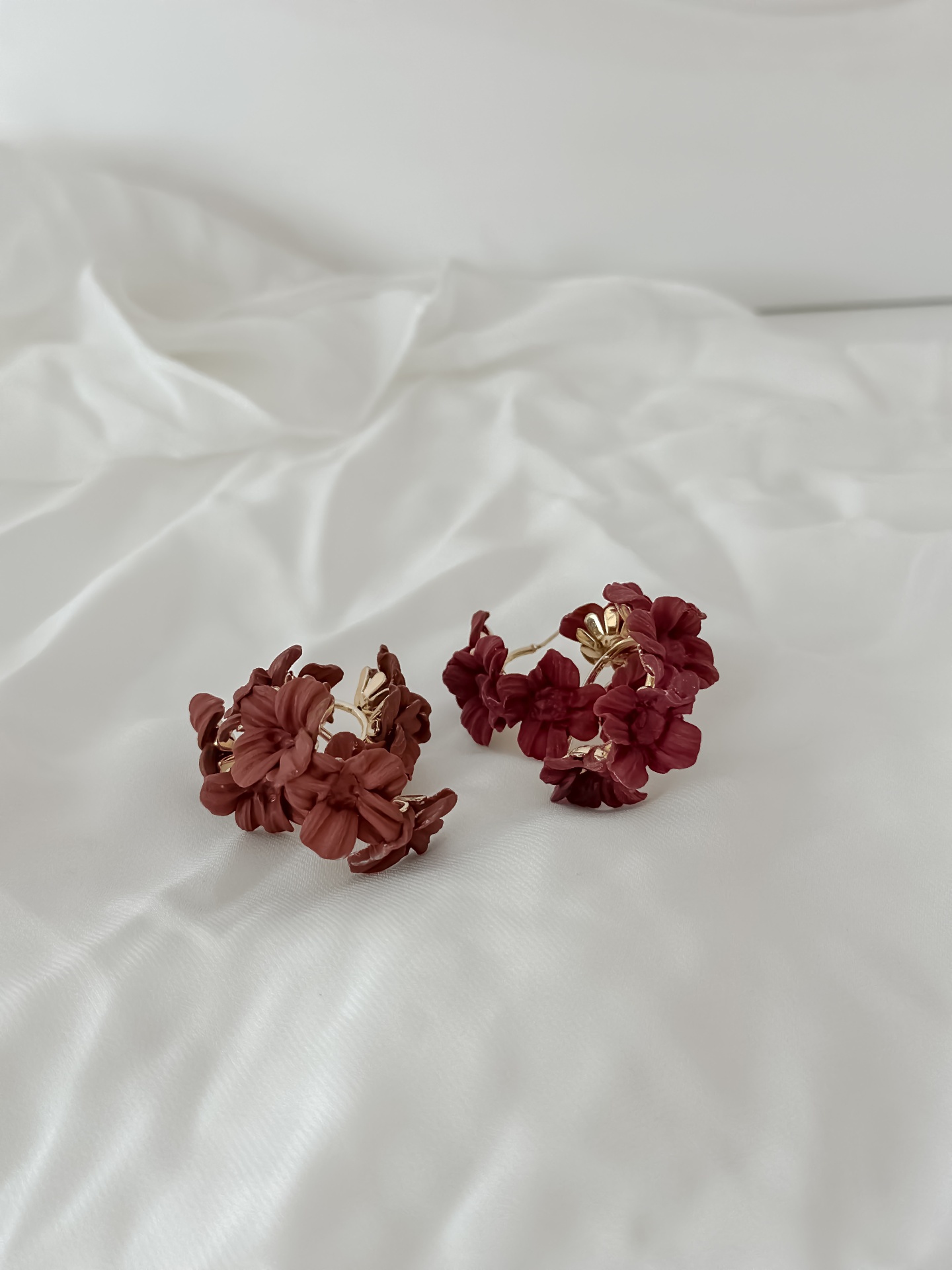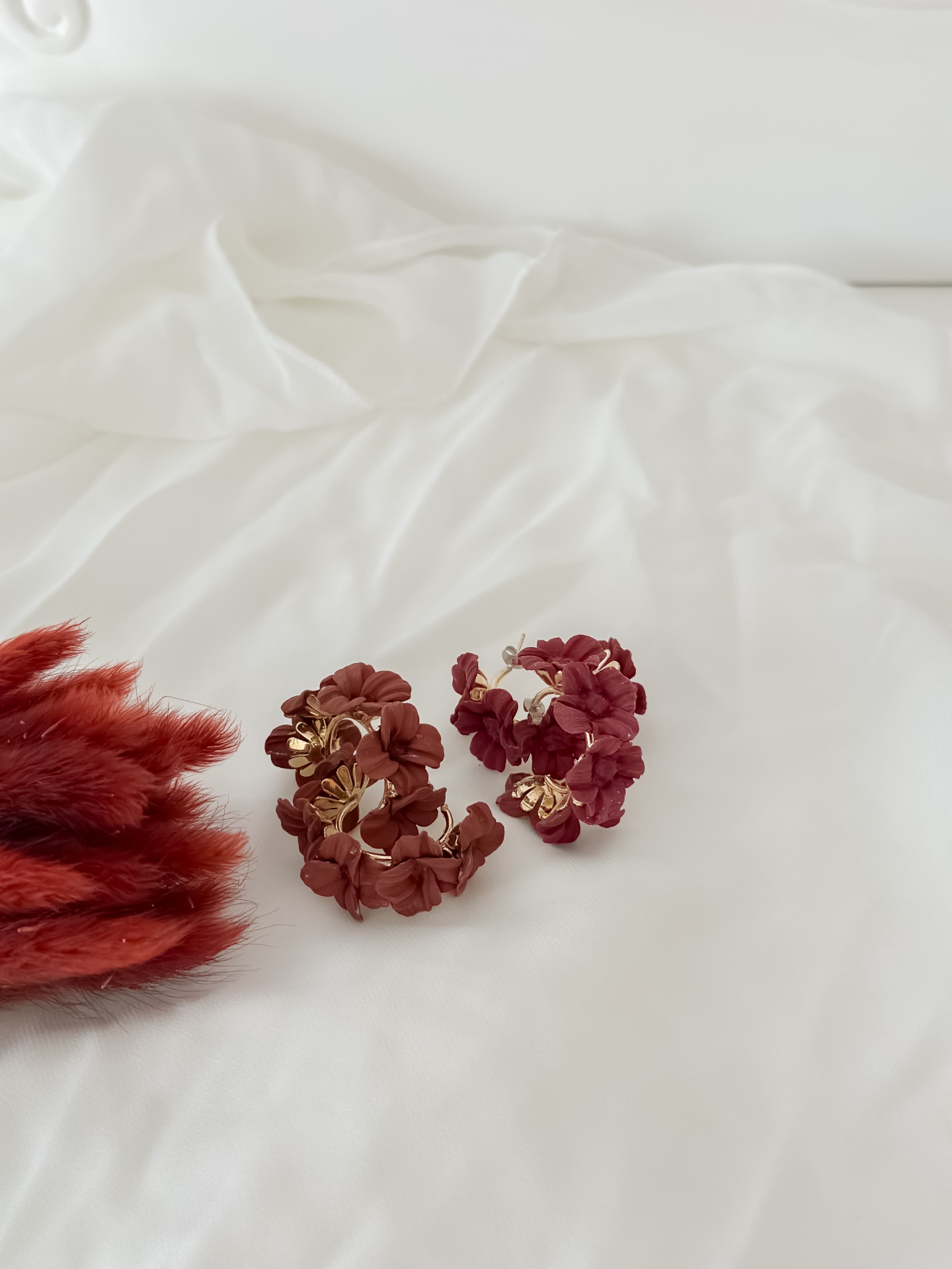Argolas super confotáveis douradas com temas florais e flores feitas à mão.