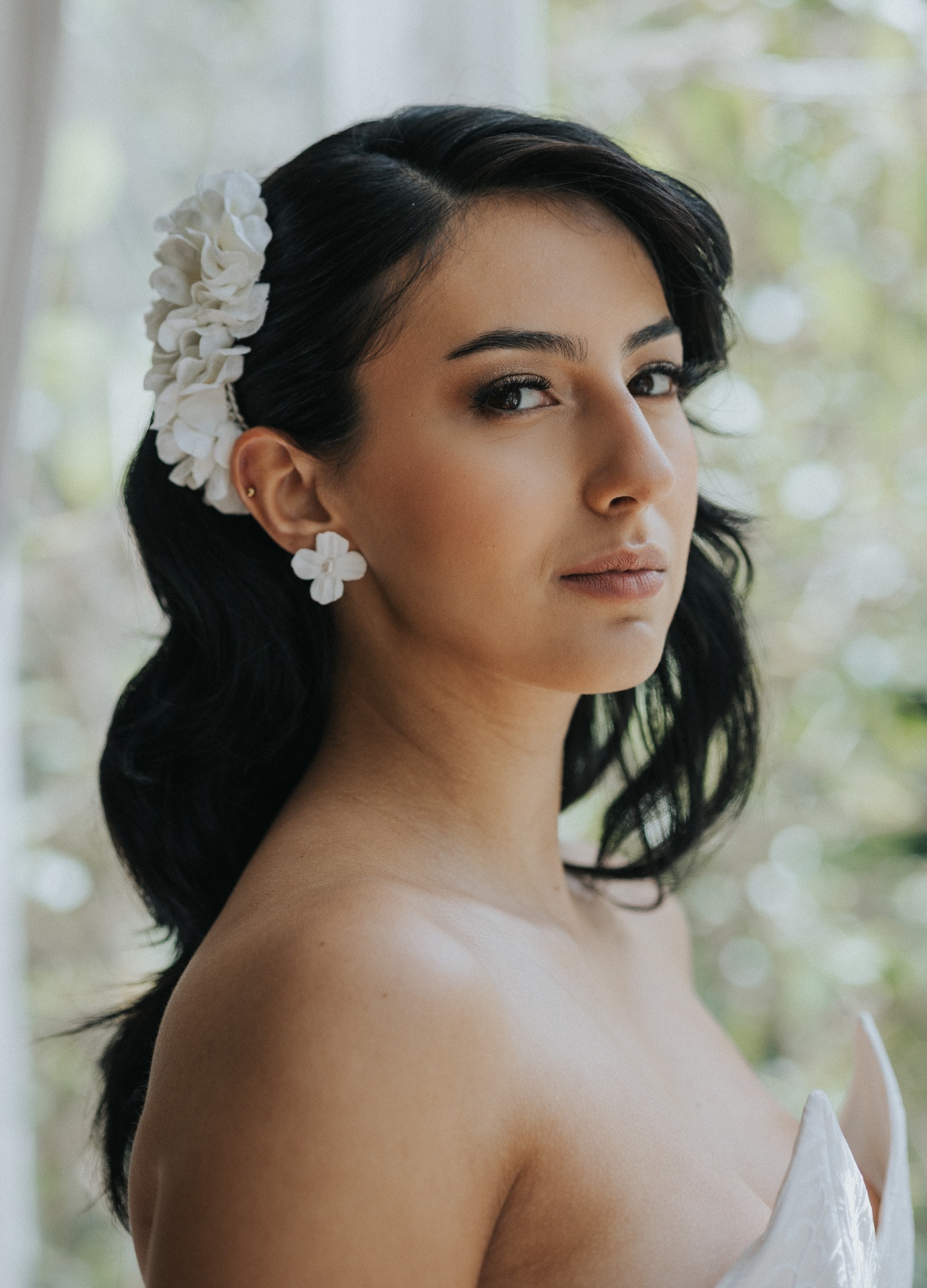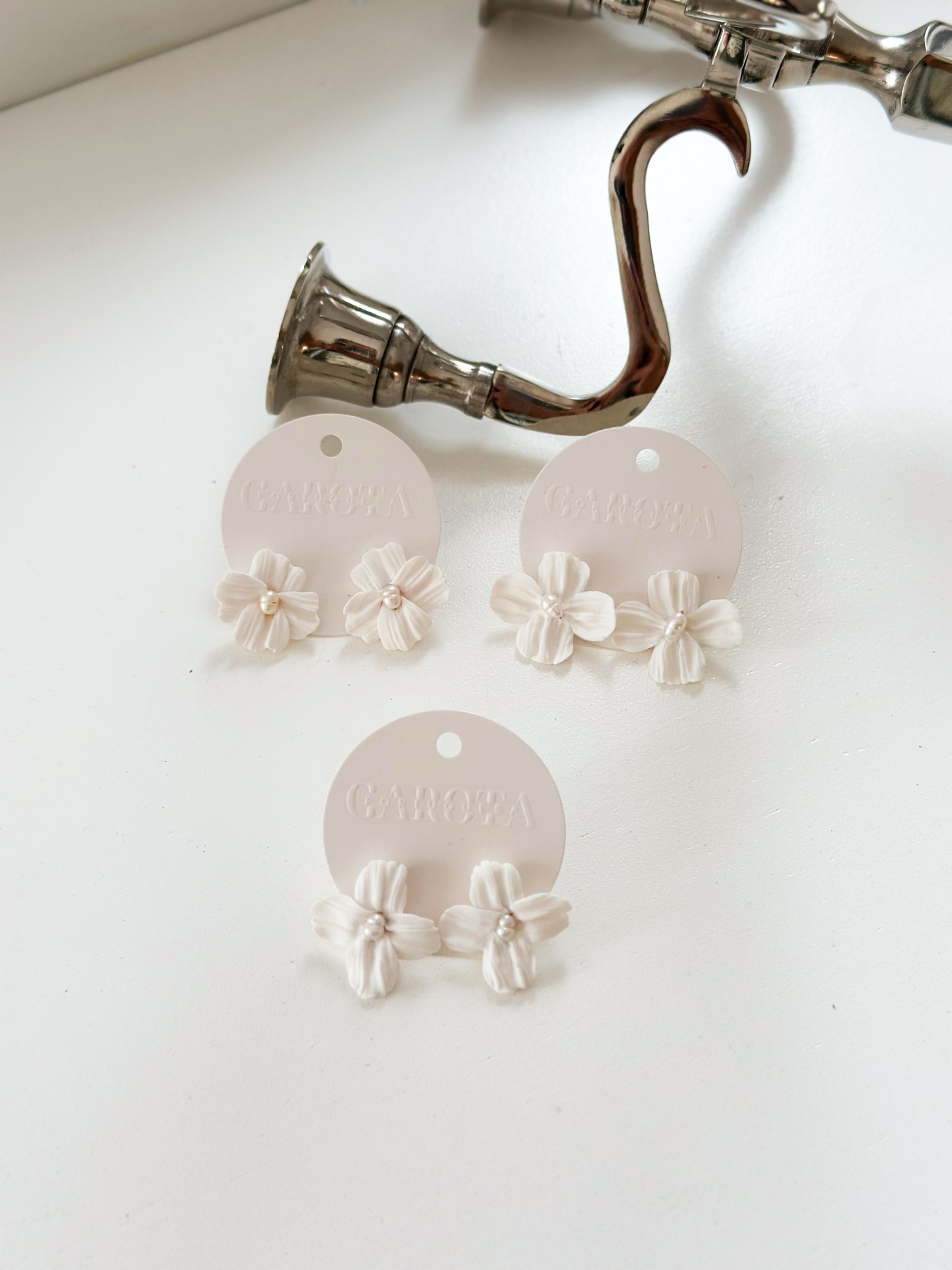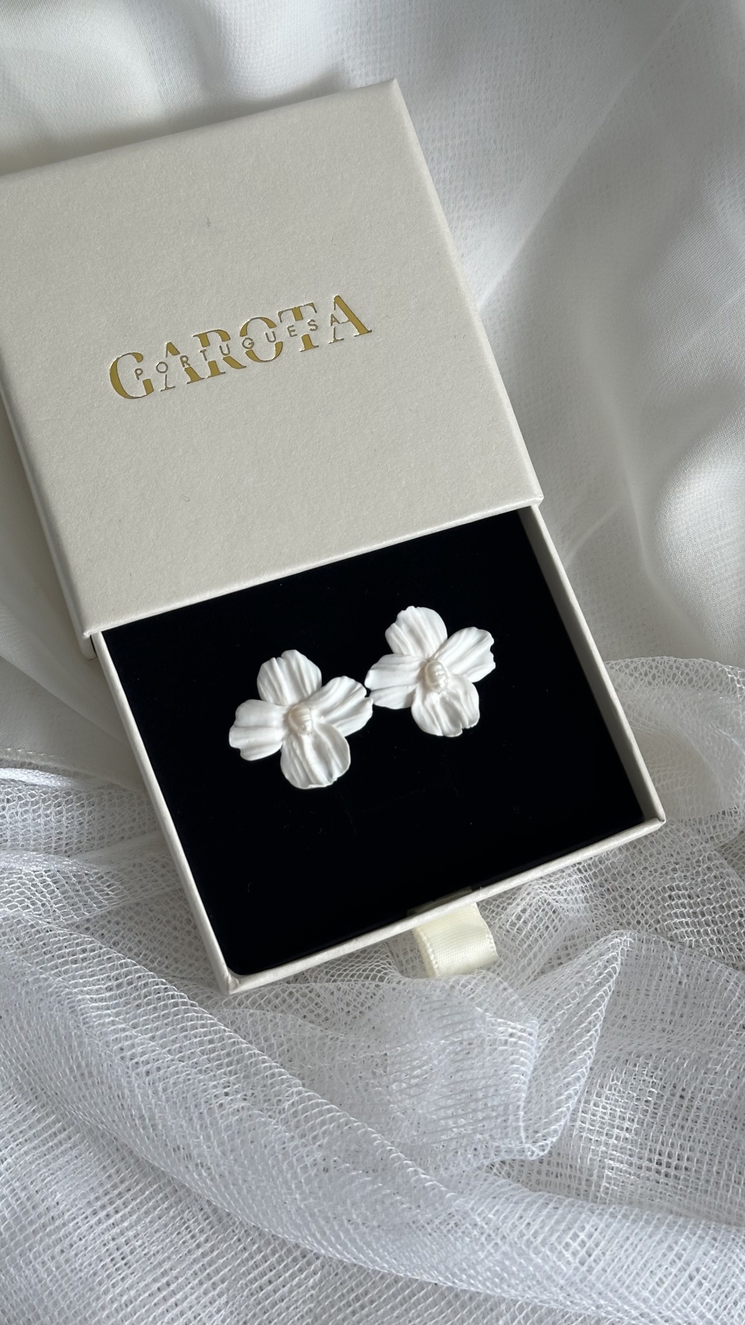 Brincos brancos, em forma de flor delicada com pérola no centro