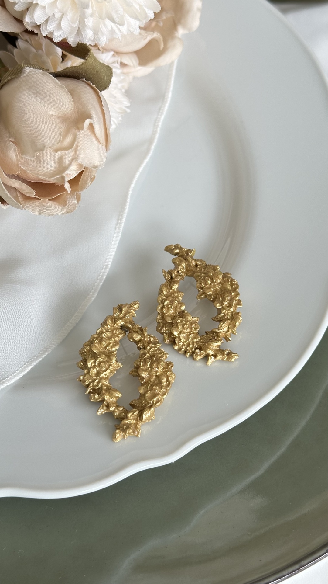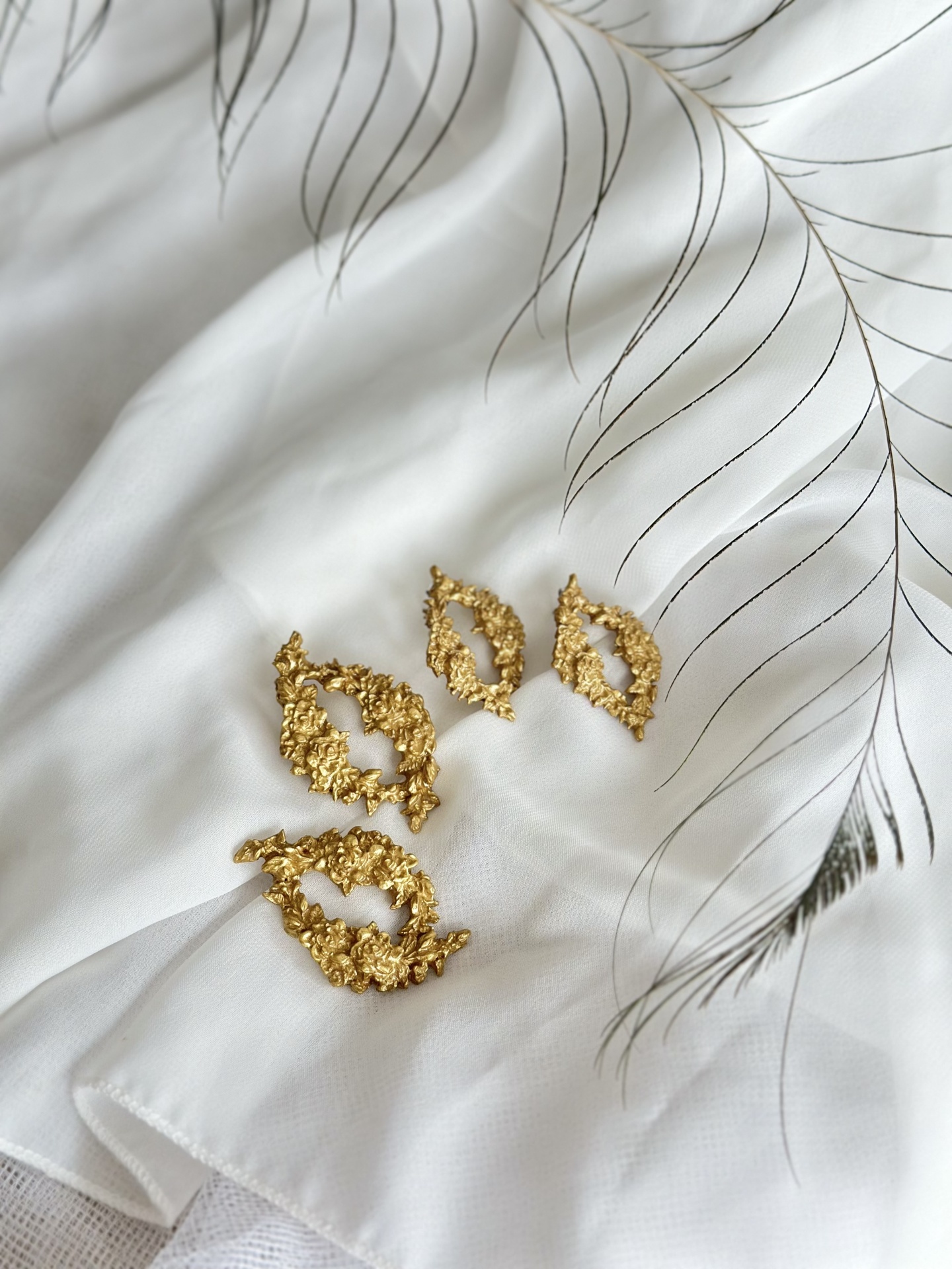 Brincos ovais ornamentados. Podem ser feitos também em prateado ou branco.