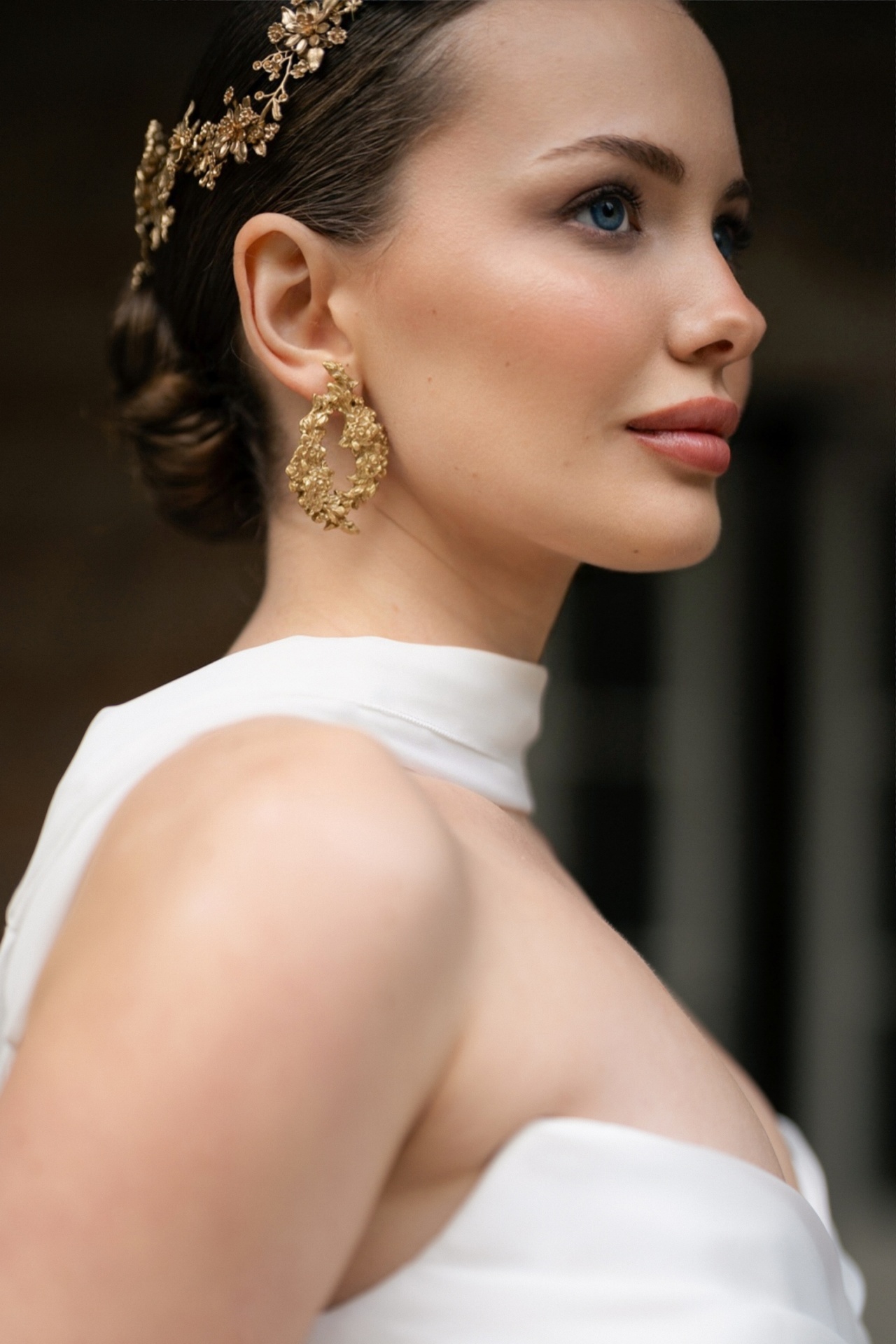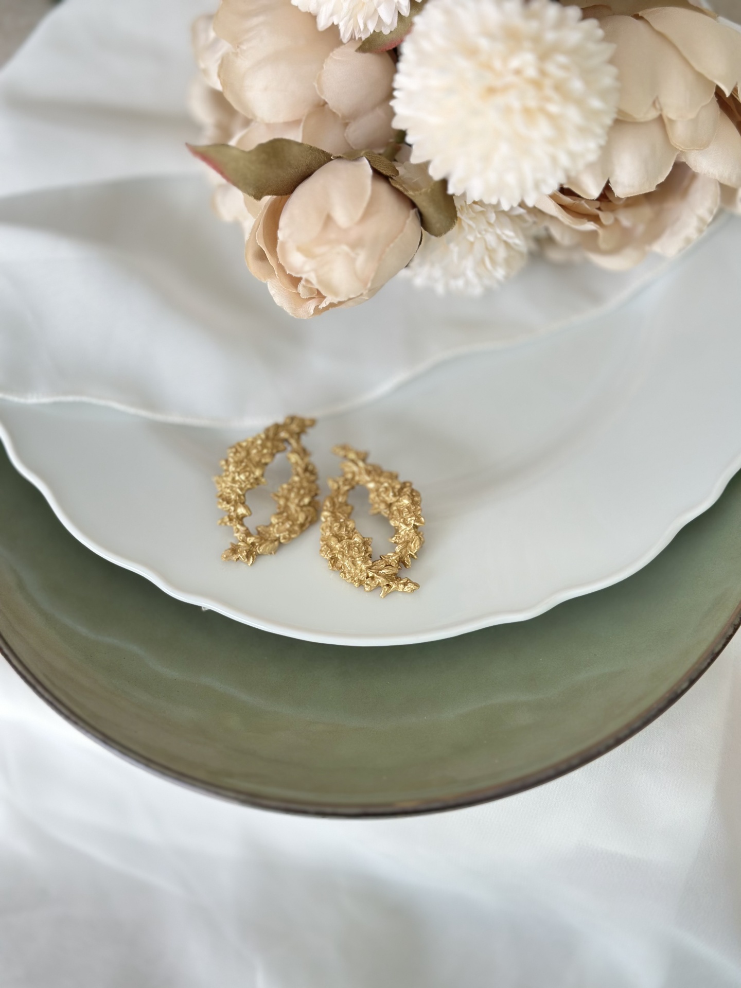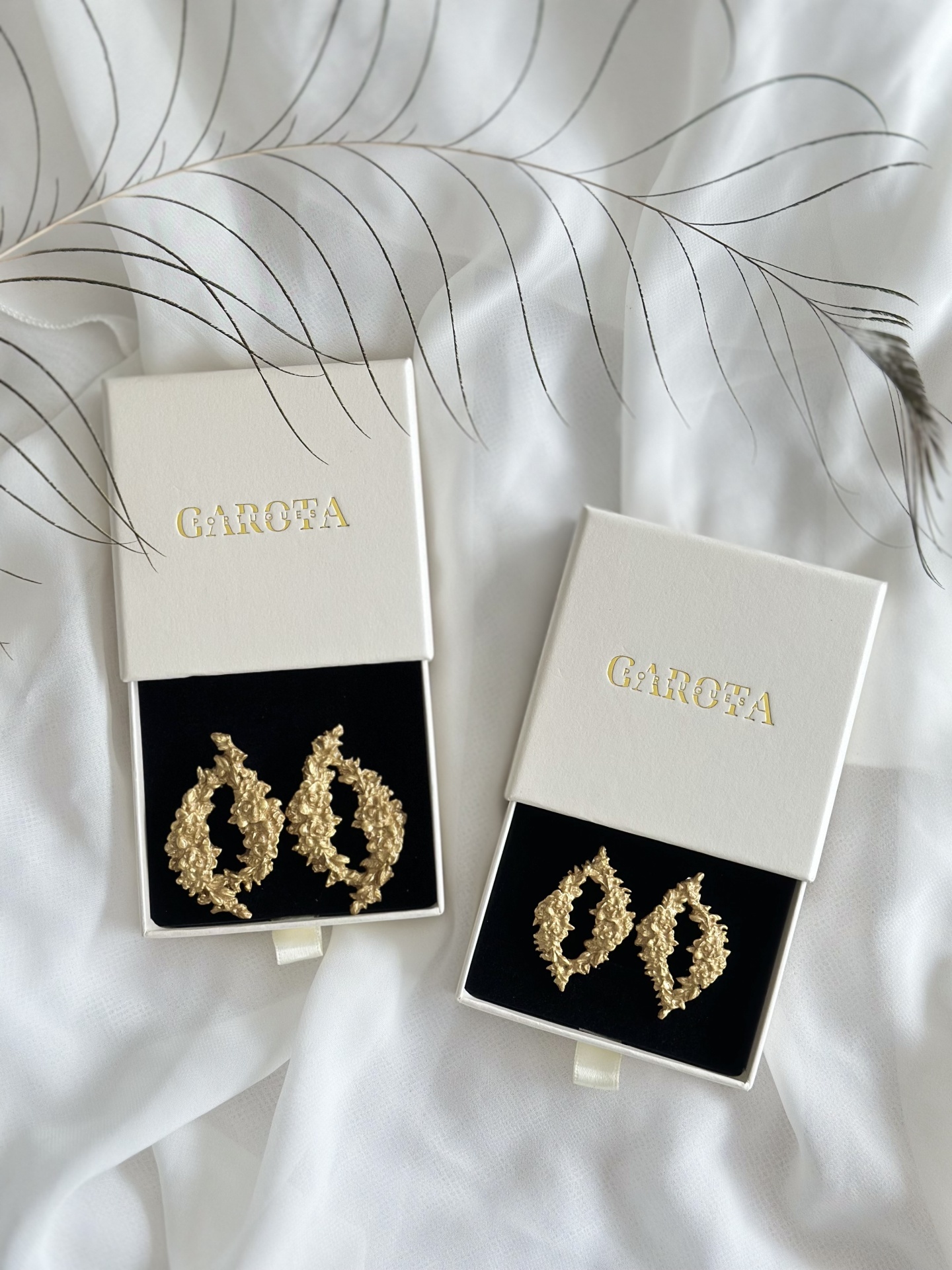 Brincos dourados arredondados com motivos florais. Estes brincos têm cerca de 5,5cm de comprimento - modelo grande; 4cm de comprimento - modelo pequeno.