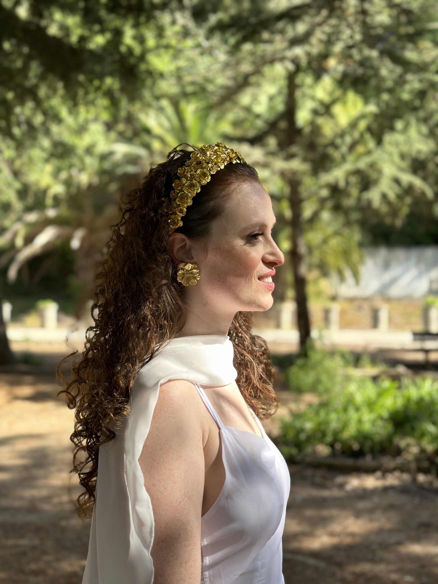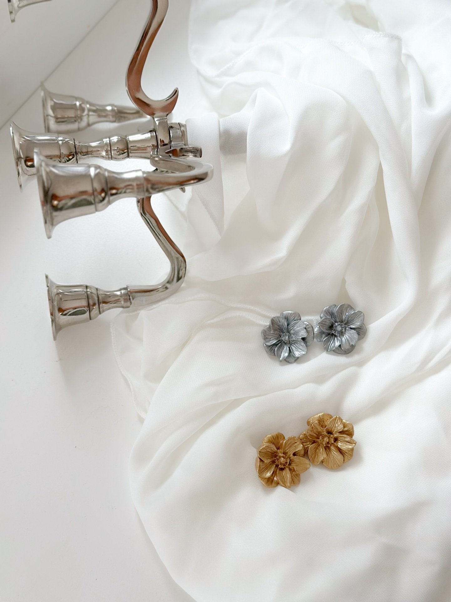 Brincos dourados em forma de flores 2D.