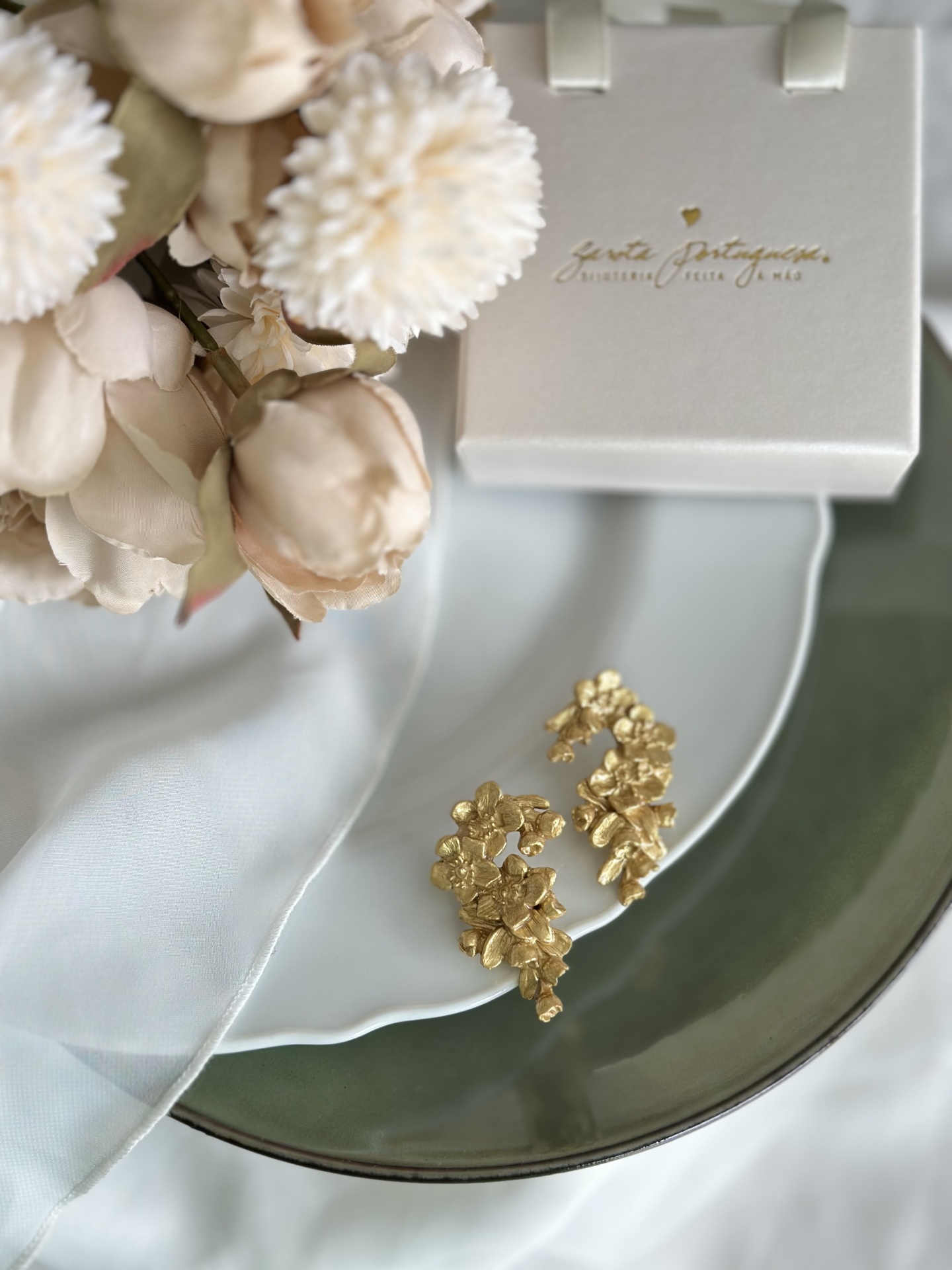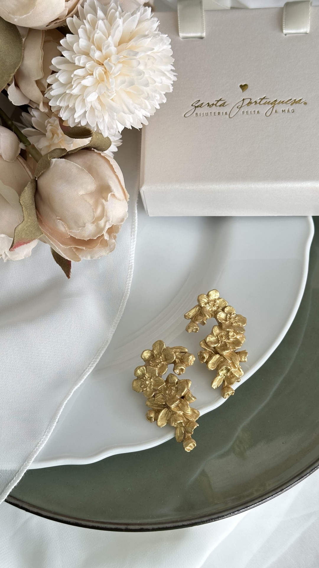 Brincos dourados com motivos florais. Estes brincos têm cerca de 5cm de comprimento.