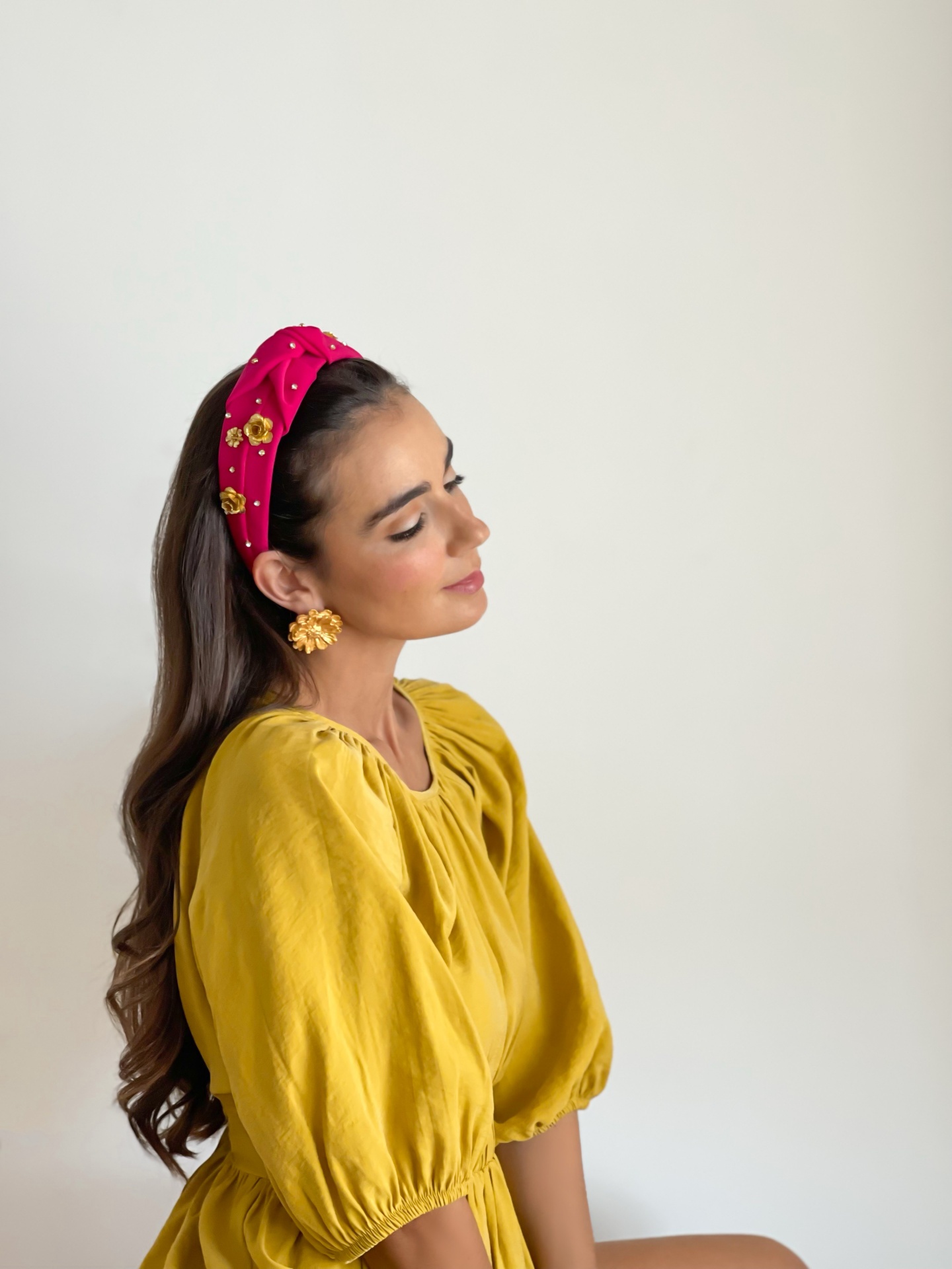 Mulher com vestido amarelo e faixa de cabelo rosa com detalhes dourados e brincos dourados