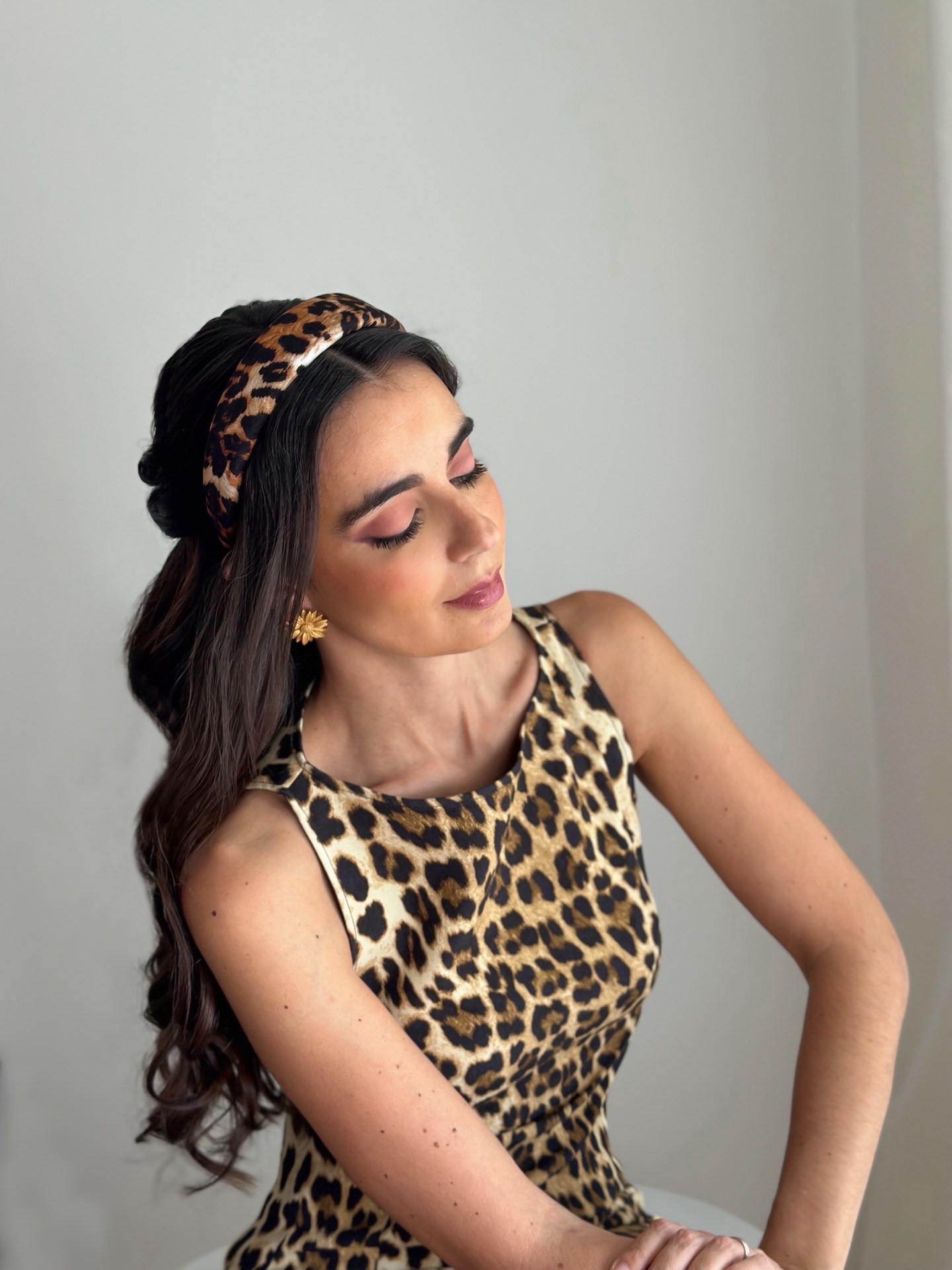Mulher com vestido e faixa de cabelo animal print padrão leopardo
