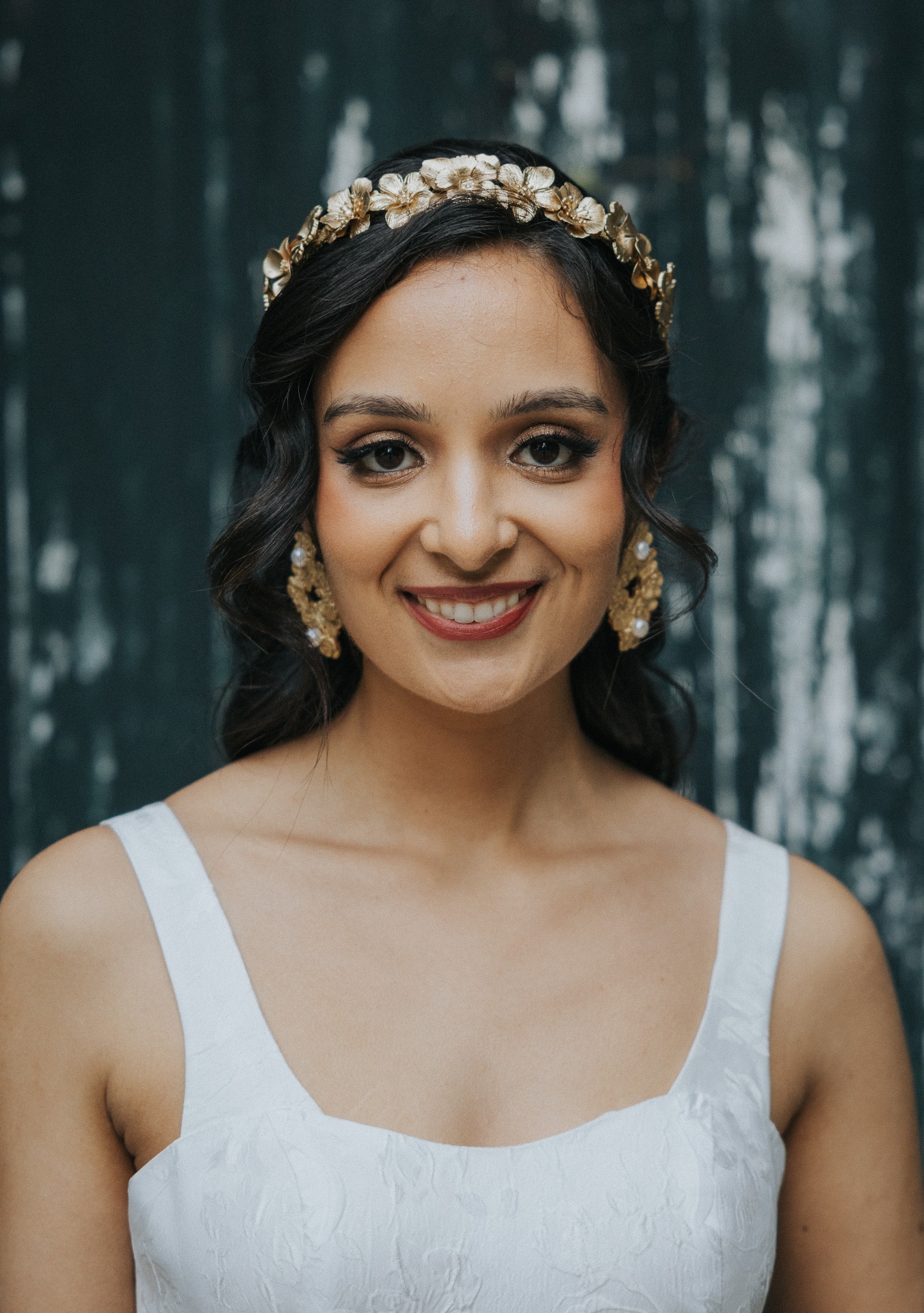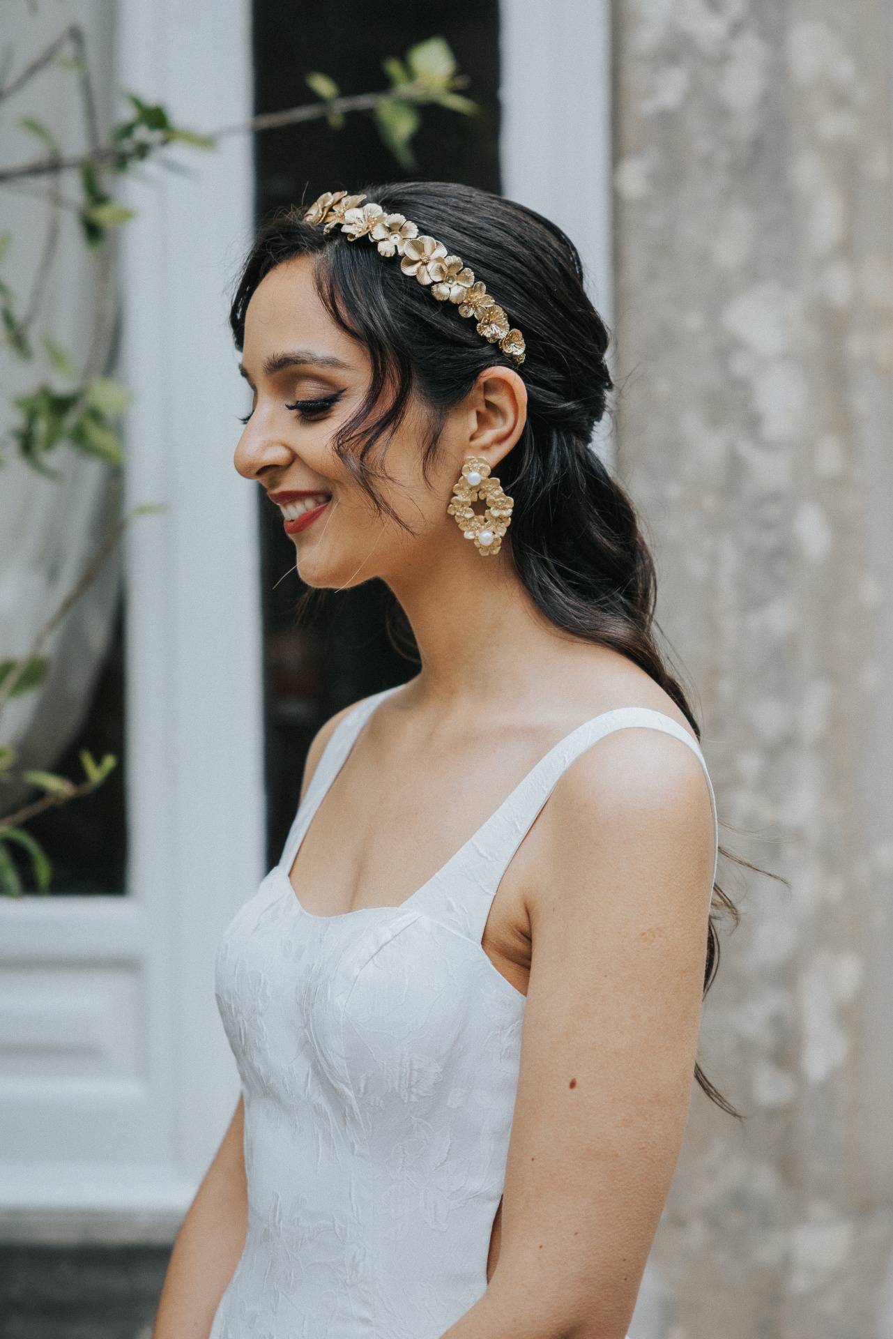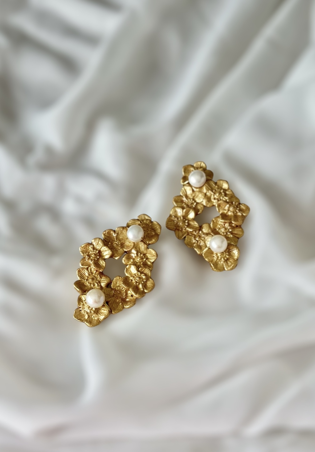 Brincos dourados em forma oval com flores, com cerca de 6cm de comprimento.