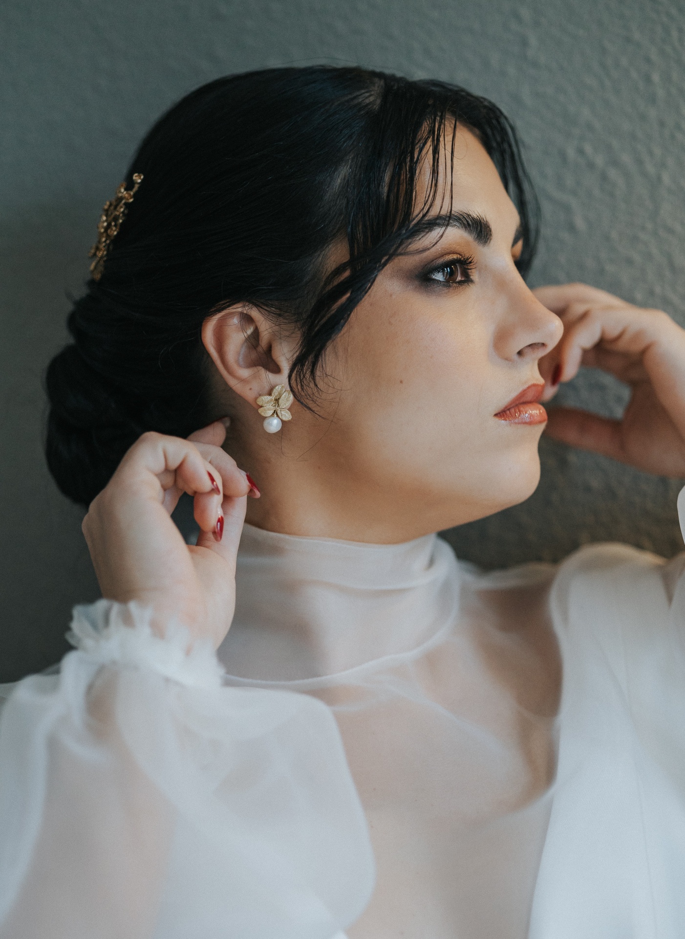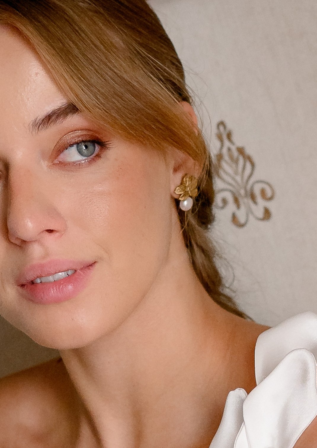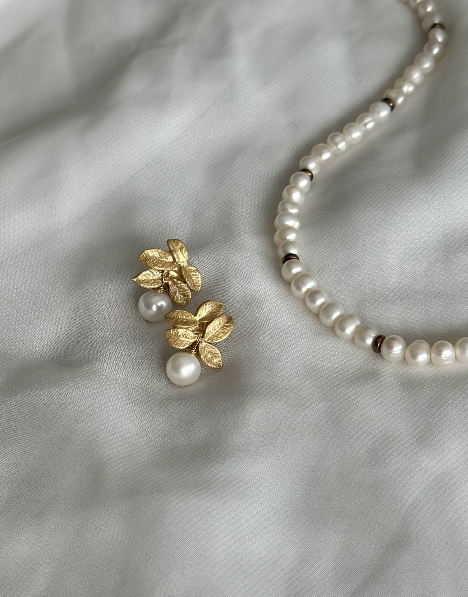 Brincos com pérolas de água. Podem também ser feitos em prateado ou branco.