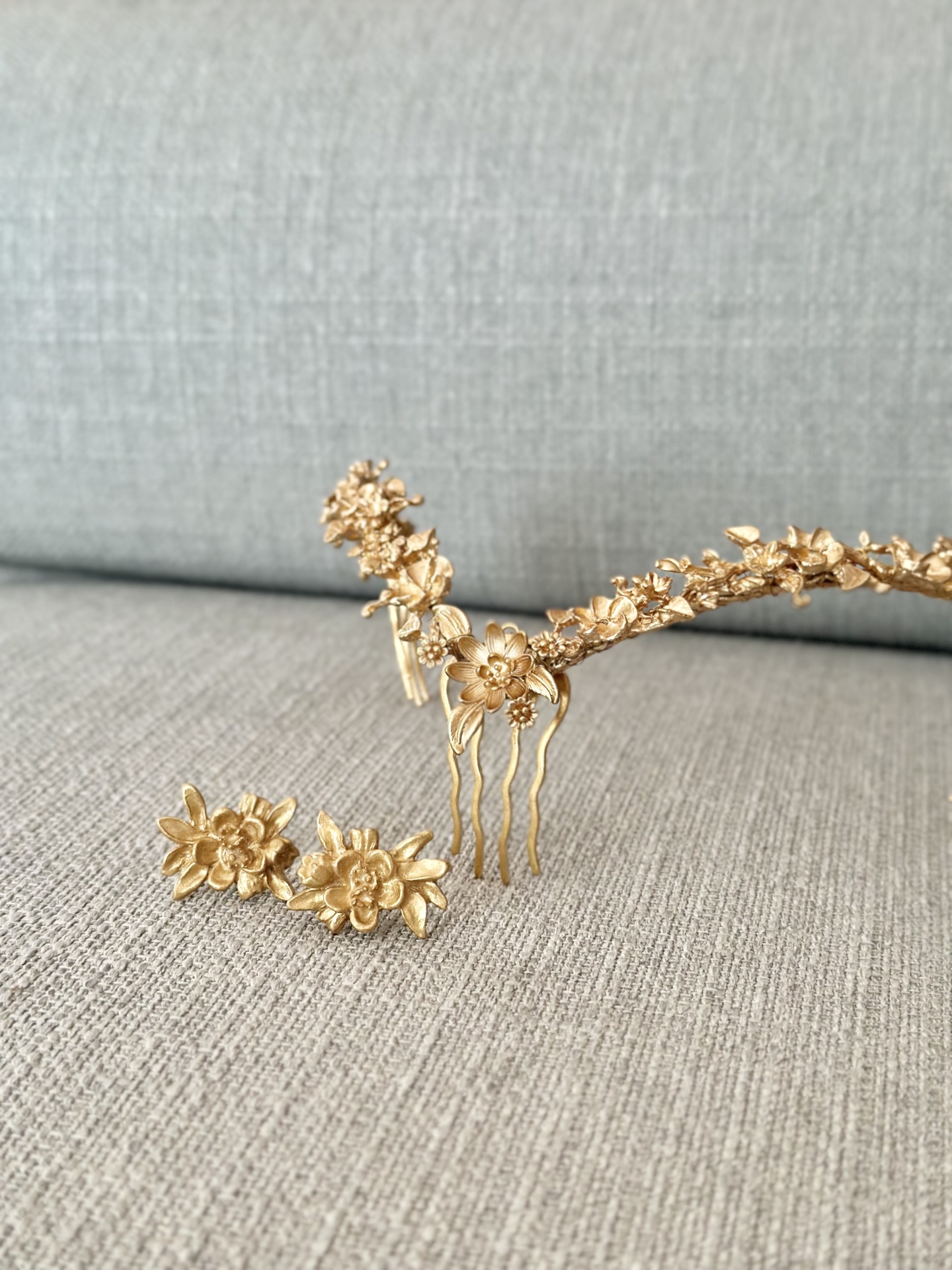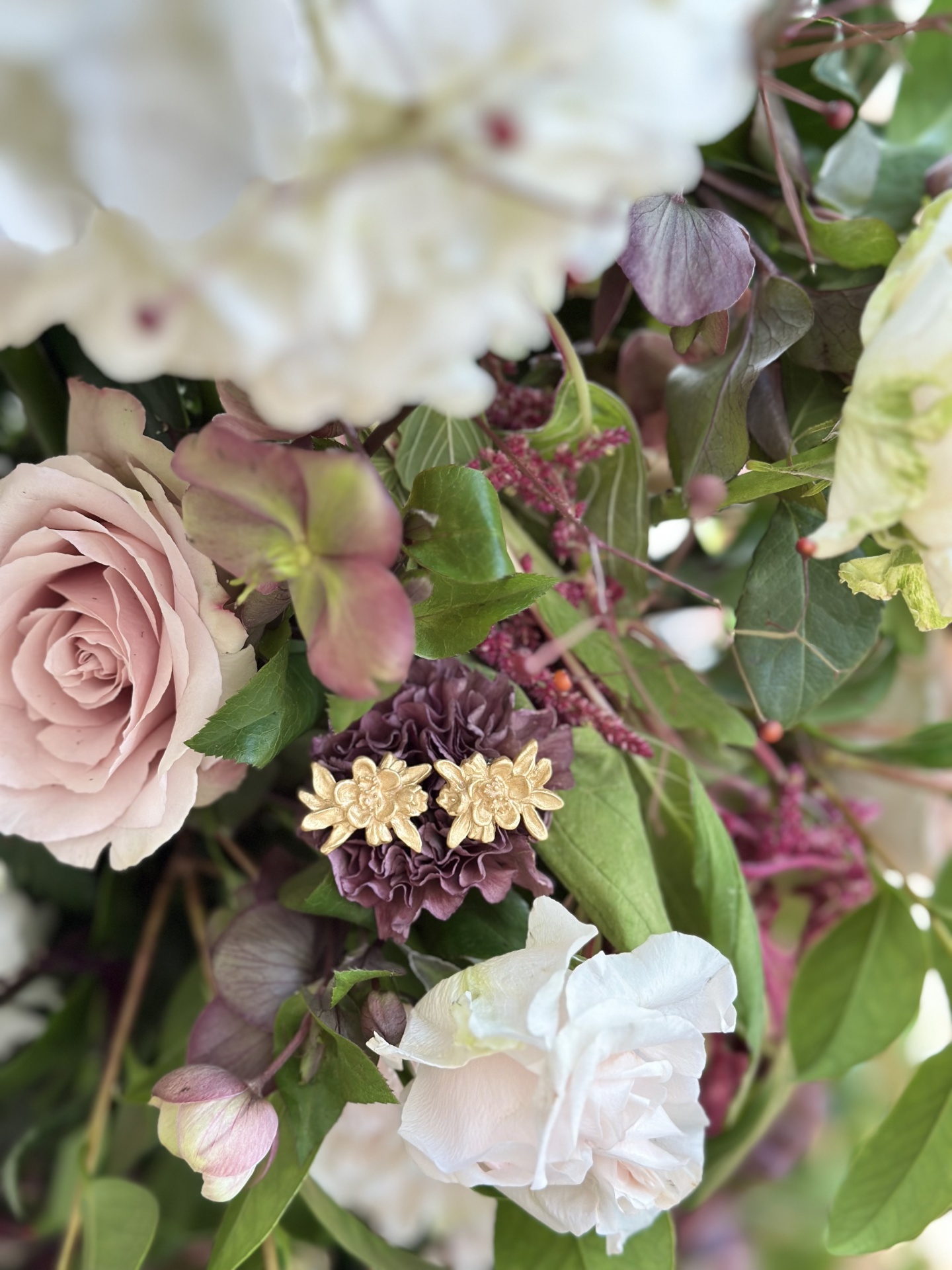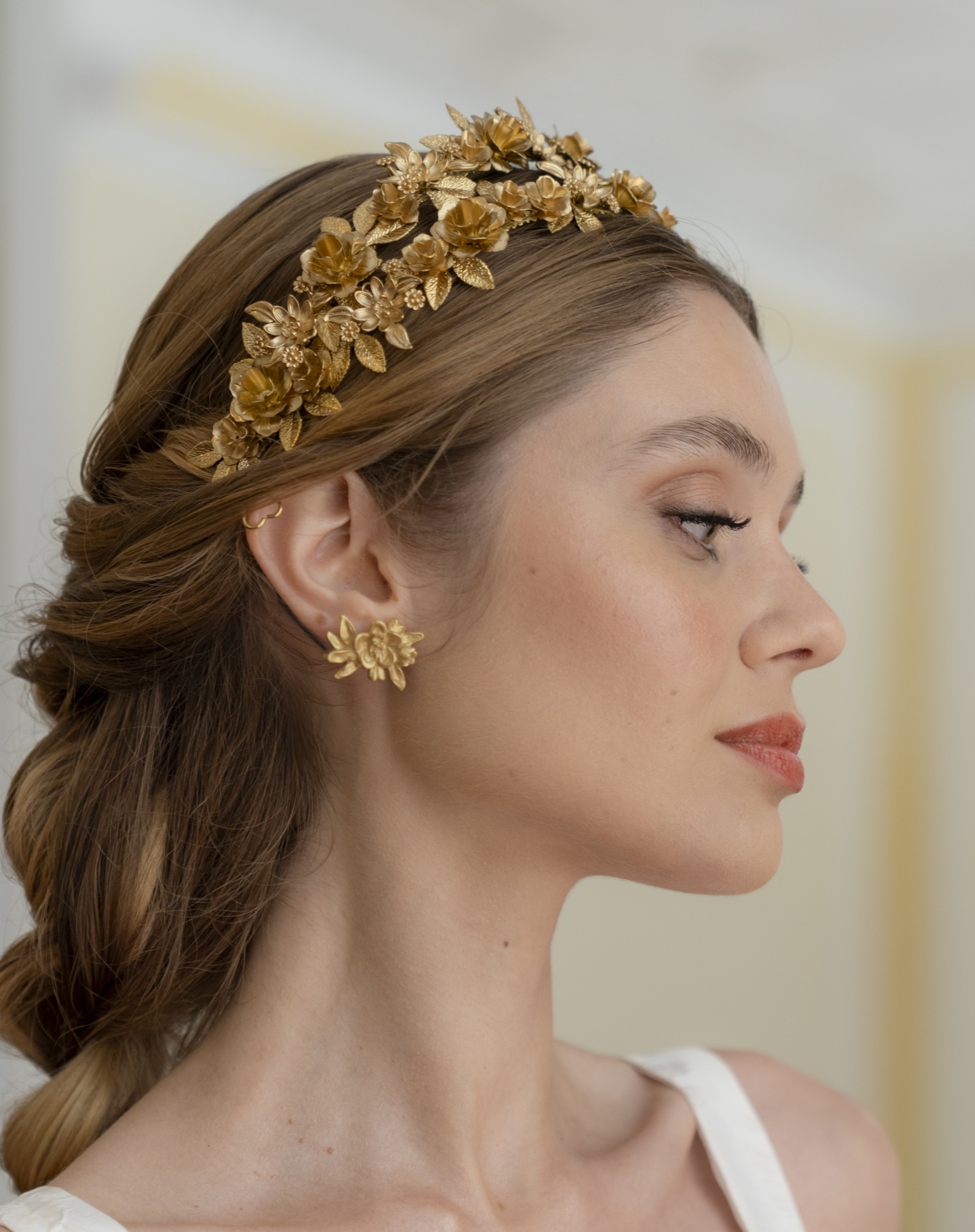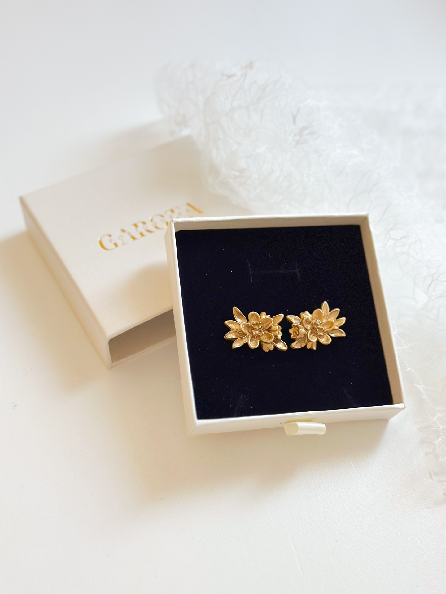 Brincos dourados de temas florais, horizontais.