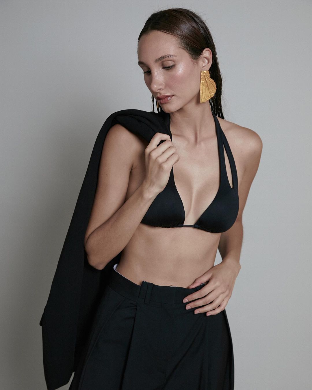 Mulher com top preto de alças finas, calças e blazer pretos, brincos amarelos grandes, fundo cinzento